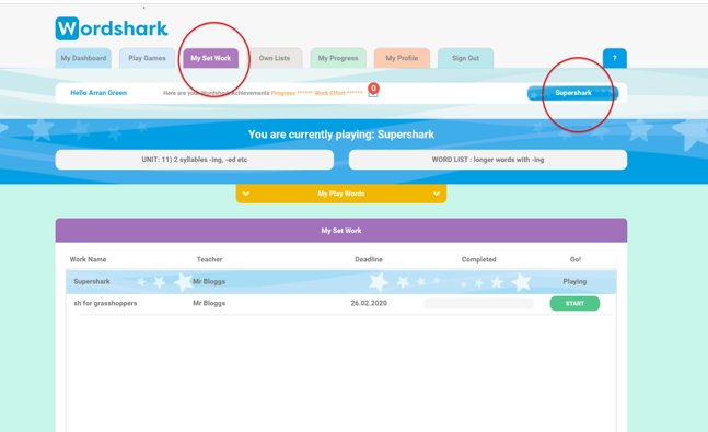 - Your teacher/s might also set you work. For example, in the image below, the student has clicked on 'My set work'. You can also see the blue 'Supershark' button that you can click back to.